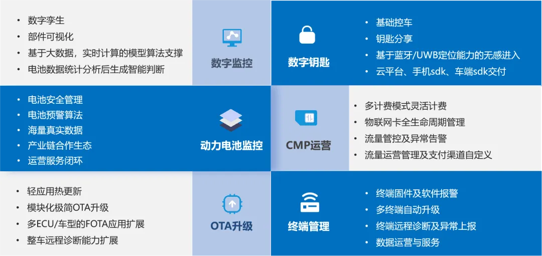 智能網(wǎng)聯(lián)開放平臺是斯?jié)櫶炖蚀蛟斓钠囍悄芫W(wǎng)聯(lián)及應用服務聚合平臺,通過接入、協(xié)議、數(shù)據(jù)、應用、服務等五大標準化技術體系以及強大的大數(shù)據(jù)底座,為用戶提供了200+ For Car組件化服務,涵蓋監(jiān)控應用、動力電池監(jiān)控、數(shù)字鑰匙、終端管理、OTA升級、CMP運營等多個維度。平臺支持多種終端集成,確保上層應用能夠根據(jù)車輛、終端、BMS整車單元的實際需求進行靈活的服務擴展。