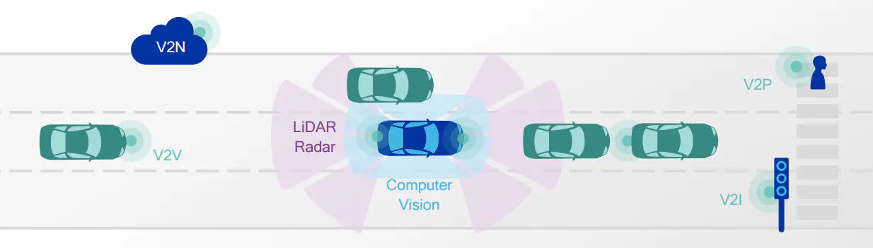 C-V2X提供兩種互補的傳輸模式,分別適用與車輛間鄰近和遠離的情況。