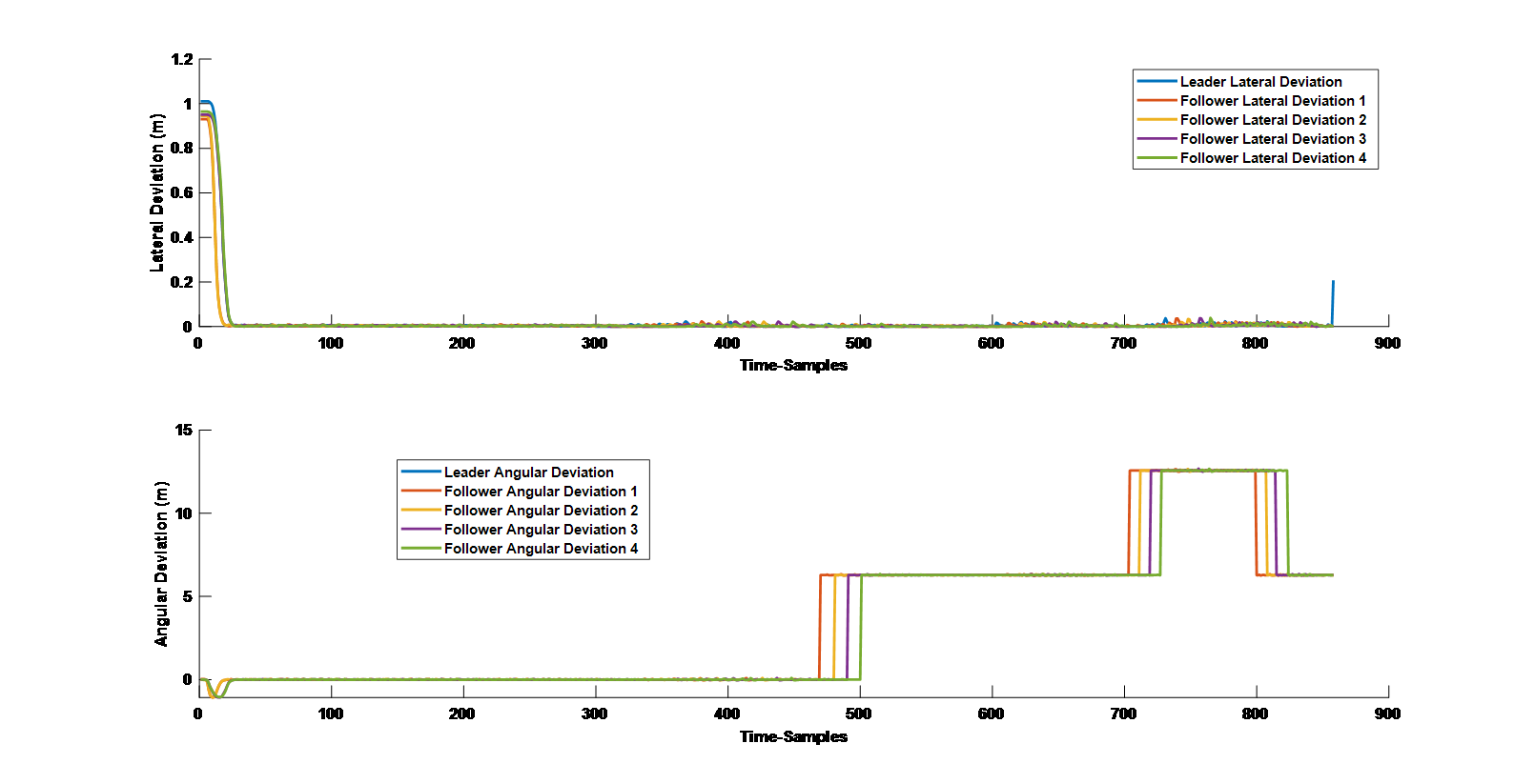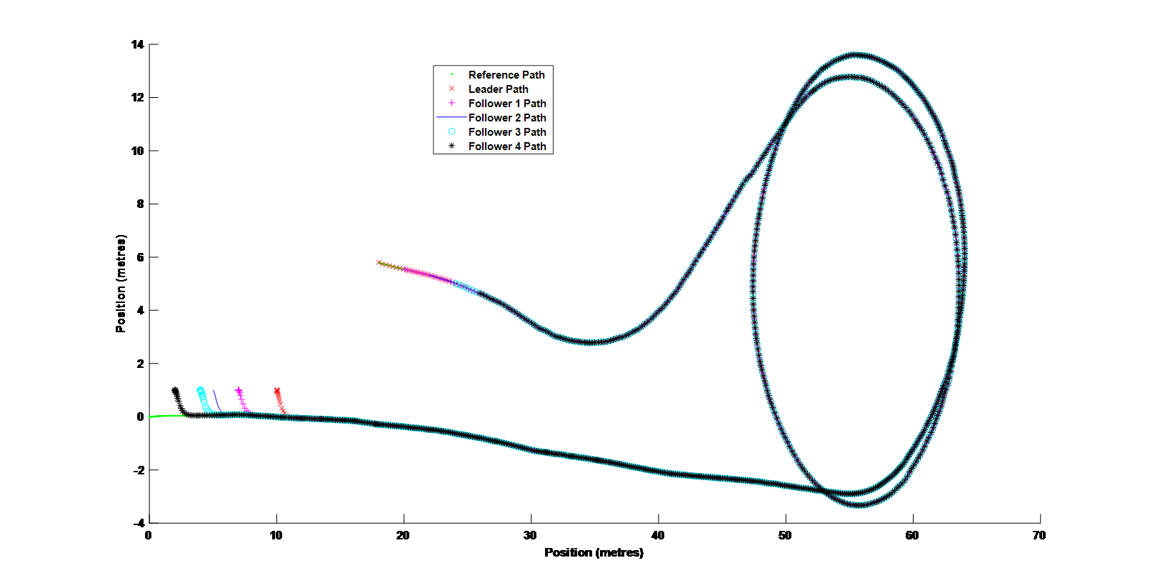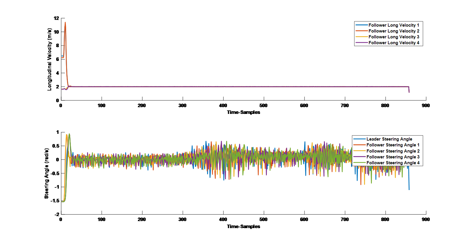 由模型的仿真結(jié)果可以看出,車隊(duì)中各個(gè)車輛的縱向速度、橫向方向盤轉(zhuǎn)角能夠保持比較好的一致性,路徑跟蹤也取得了比較好的效果,驗(yàn)證了本論文所提出的混合控制算法的有效性。