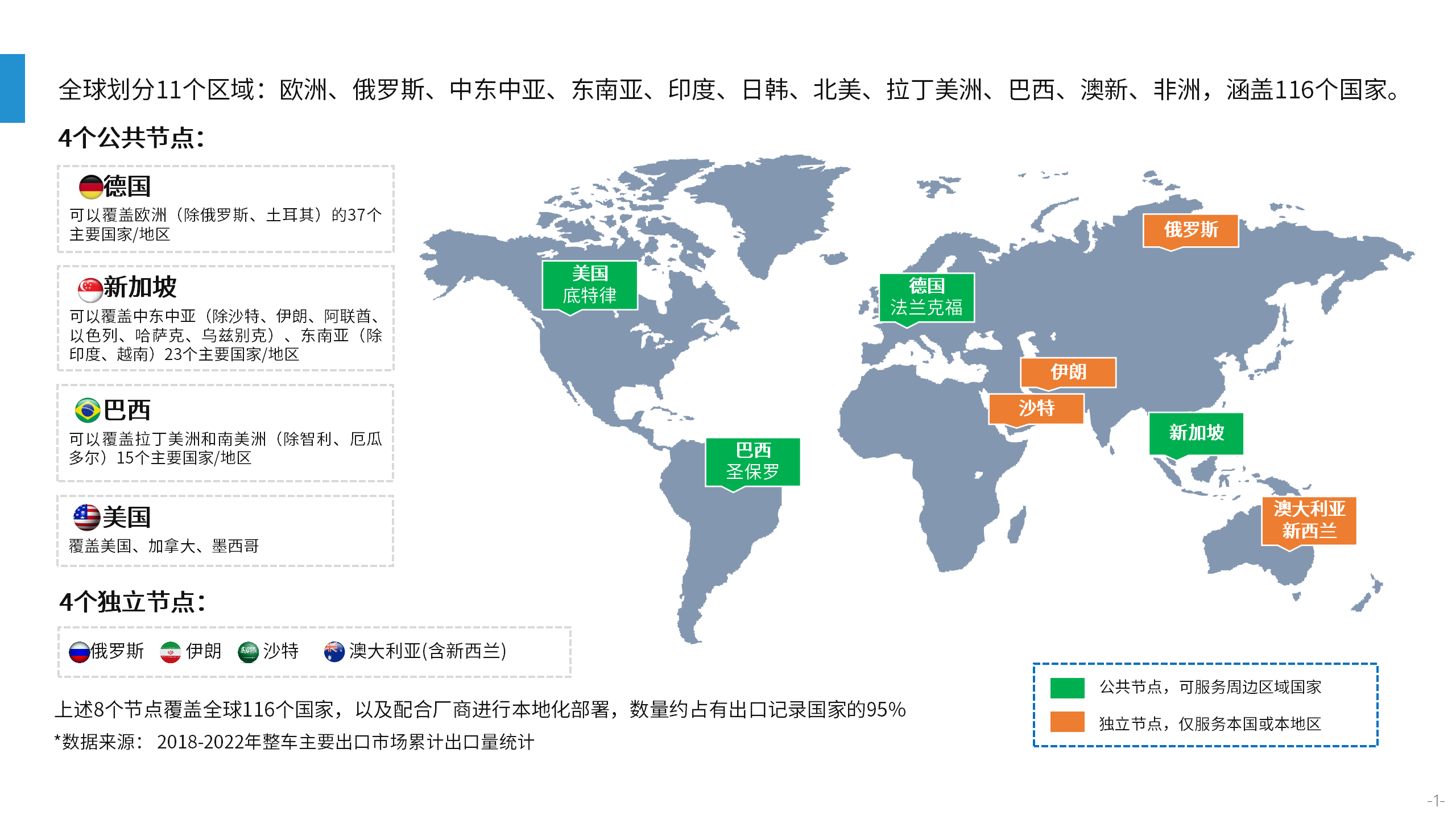 在全球化戰(zhàn)略布局中,斯?jié)櫶炖示臉?gòu)建了4個公共節(jié)點,分別位于德國、新加坡、巴西及美國,并額外設(shè)立4個獨立節(jié)點,覆蓋俄羅斯、伊朗、沙特以及澳大利亞(含新西蘭),總計覆蓋全球11個區(qū)域、116個國家。我們提供全面的跨境對接服務(wù)、確保數(shù)據(jù)合規(guī)性、產(chǎn)品認(rèn)證等智能網(wǎng)聯(lián)領(lǐng)域的配套服務(wù),以滿足全球客戶的多樣化需求。