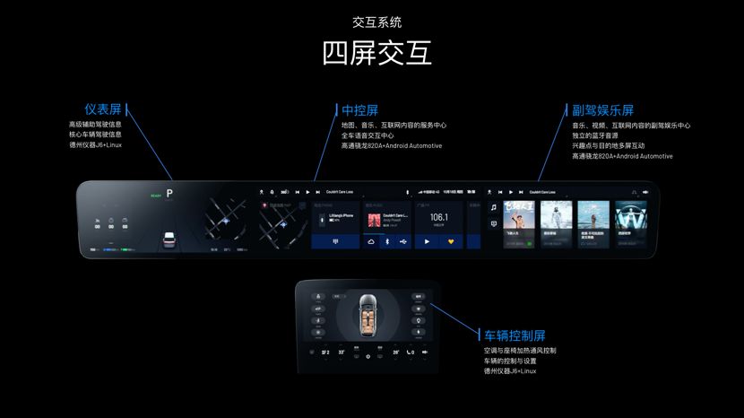 此外,范皓宇介紹,該系統(tǒng)的最大特點(diǎn)是通過四屏交互的方式將堆疊在一起的應(yīng)用拆分。駕駛員前方的儀表屏僅顯示車輛信息和ADAS,使駕駛員的注意力不被過度分散。副駕駛設(shè)置了專屬的娛樂屏,并有獨(dú)立的藍(lán)牙,與駕駛員互不干擾。另外兩塊屏幕分別是中控屏幕和車輛控制屏。中控屏主要用于集成應(yīng)用,而位于傳統(tǒng)空調(diào)控制區(qū)域的車輛控制屏單獨(dú)設(shè)立一塊屏幕,則是因?yàn)檫@是最用戶最高頻、剛需的功能,獨(dú)立屏幕可以讓用戶對空調(diào)的控制更加簡單、便捷。
