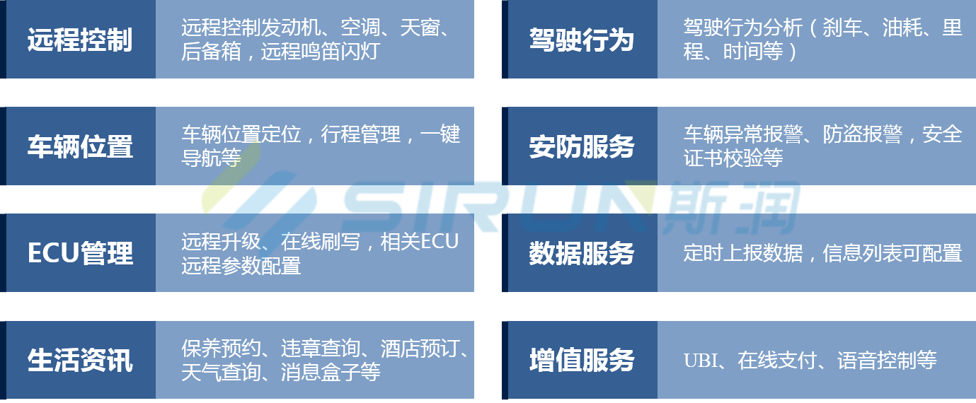 T-Box 作為無線網(wǎng)關(guān)為整車提供遠程通訊接口,可以提供行車數(shù)據(jù)采集、行駛軌跡記錄、車輛故障監(jiān)控、車輛遠程控制(開閉鎖、空調(diào)控制、車窗控制、發(fā)送機扭矩限制、發(fā)動機啟停)、駕駛行為分析、4G 無線熱點分享等服務。
